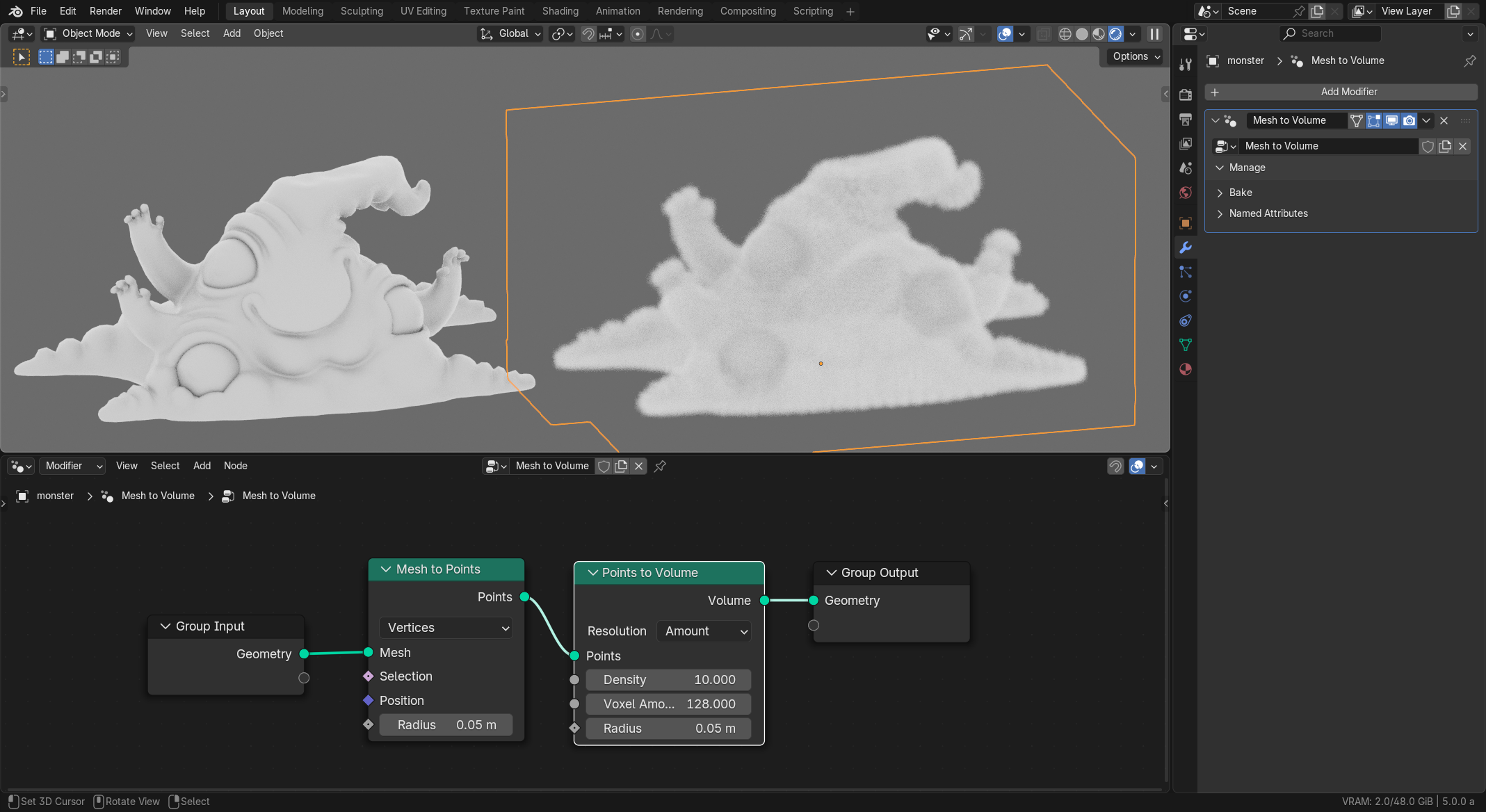 Point Density(点密度)テクスチャノードが削除され、スパースボリュームとしてもっと効率的にレンダリングするジオメトリノードに置き換えられました。色のコントロールがしづらくなるという制限がありますが、ジオメトリノードのボリュームへの今後の改善で復元される予定です。(PR#140292)