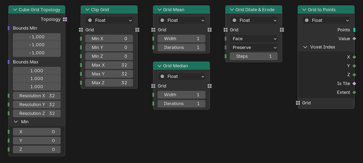 新しい Cube Grid Topology(立方体グリッドトポロジー)ノードは、一からグリッドを生成でき、立方体内のボクセルはすべてアクティブ化されます。主に既存の Field to Grid(フィールドのグリッド化)ノードとともに、同じトポロジーの複数のグリッドを初期化する可能性がある時に使用します。(620ecf1324441b95ef64b80fd97f083ab72233ed)