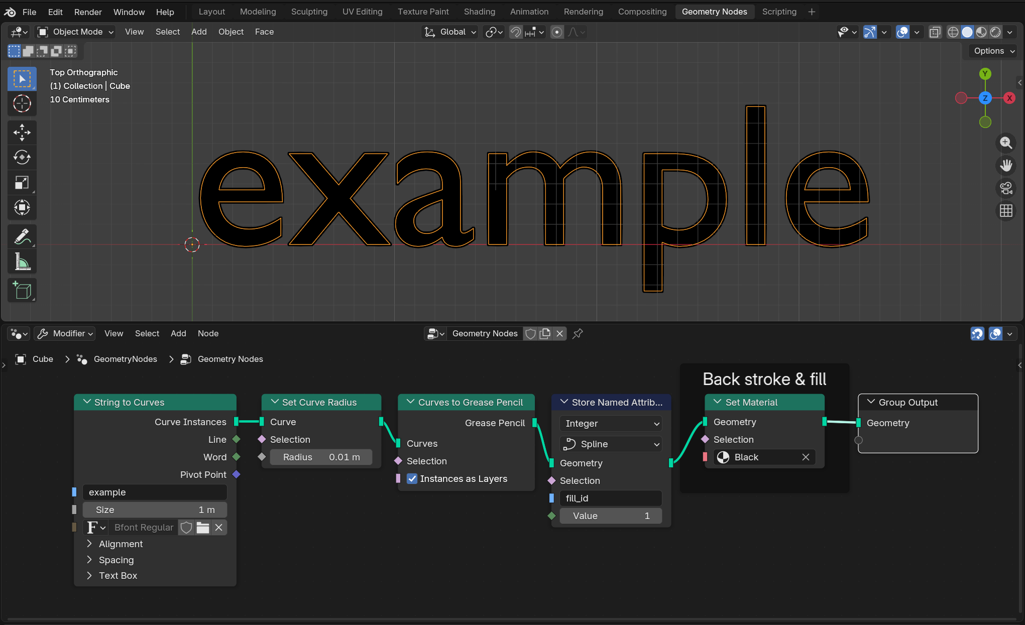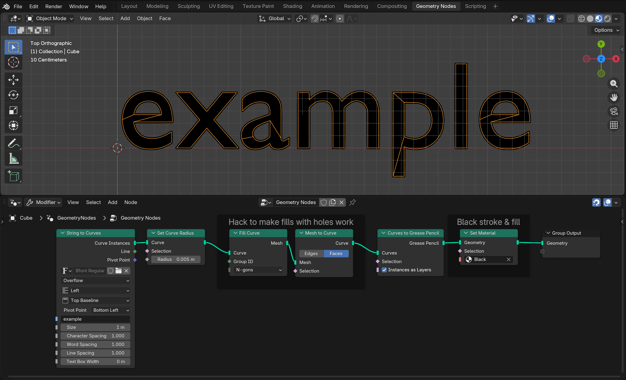 例: このセットアップは文字列をグリースペンシルフィルに変換します。5.0 では穴を得るためにハック(文字の複数のパーツへの分割)が必要でした。5.1ではカーブはフィルするために fill_id が必要ですが、ハックはもう必要ありません。